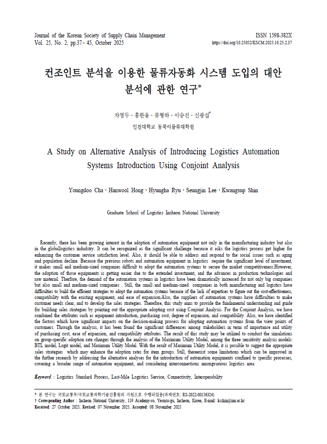 컨조인트 분석을 이용한 물류자동화 시스템 도입의 대한 분석에 관한 연구 작성자 DNA융합대학원관리자 작성일 2026-01-08 조회수 15 첨부파일 (게재논문)컨조인트 분석을 이용한 물류자동화 시스템 도입의 대안.pdf ( 628.2K )다운로드 컨조인트 분석을 이용한 물류자동화 시스템 도입의 대한 분석에 관한 연구