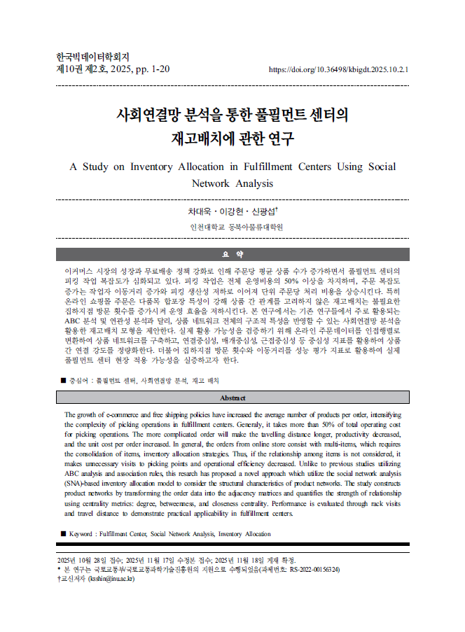 사회연결망 분석을 통한 풀필먼트 센터의 재고배치에 관한 연구 작성자 DNA융합대학원관리자 작성일 2026-01-08 조회수 15 첨부파일 사회연결망 분석을 통한 풀필먼트 센터의 재고배치에 관한 연구.pdf ( 1.2M )다운로드 사회연결망 분석을 통한 풀필먼트 센터의 재고배치에 관한 연구